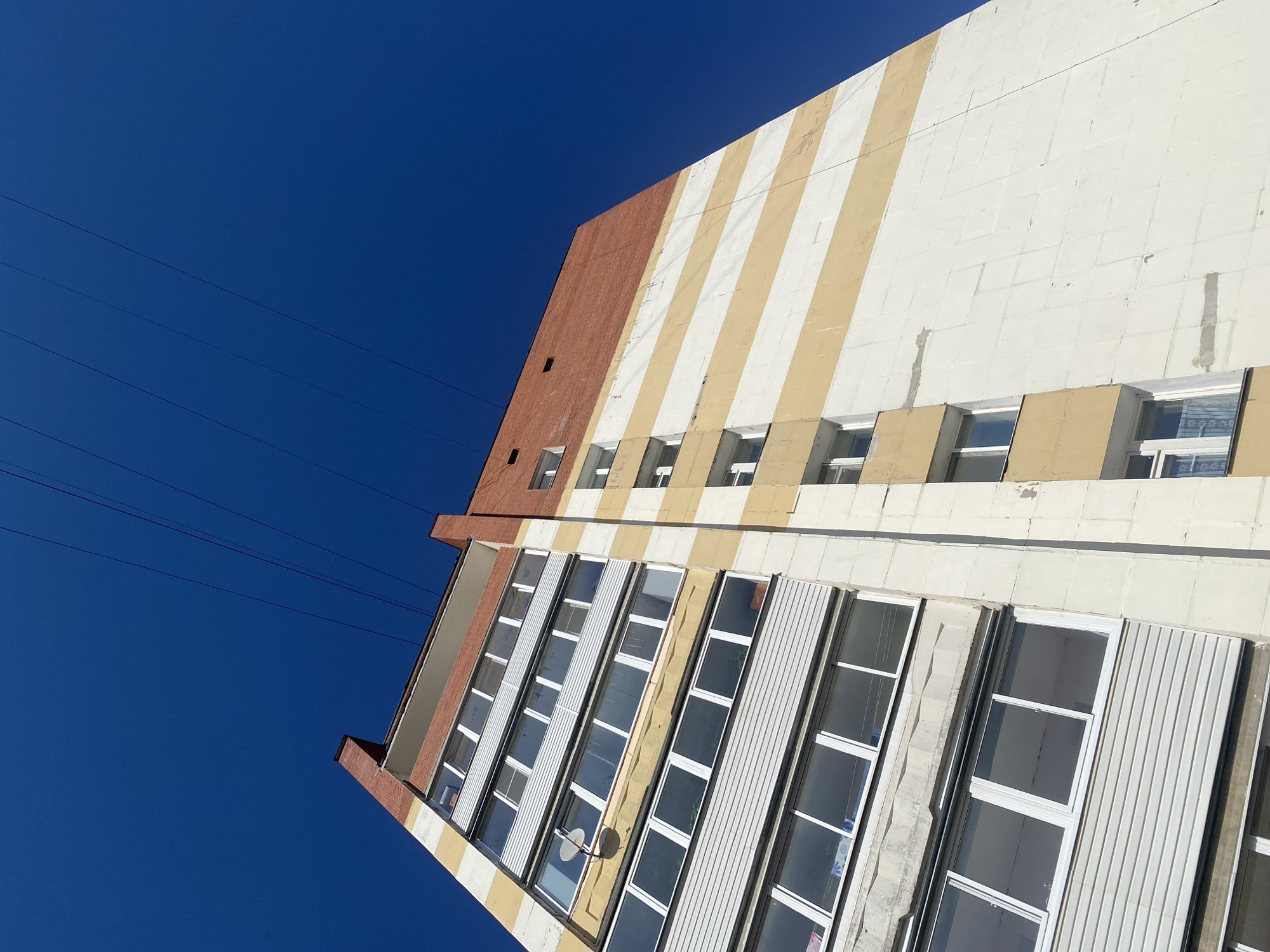 An angled low-angle shot shows a tall, multi-story building against a clear blue sky. The building has a mix of architectural styles, including horizontal bands of brick and stucco, as well as vertical stripes painted in white and light tan. The building features several floors of windows, with some variations in design and size. A few thin, dark wires are visible in the upper-left part of the frame, seemingly suspended against the sky. The angle and composition highlight the height of the building and the clarity of the sky. This building is located in the city of Chaikovsky, Russia.