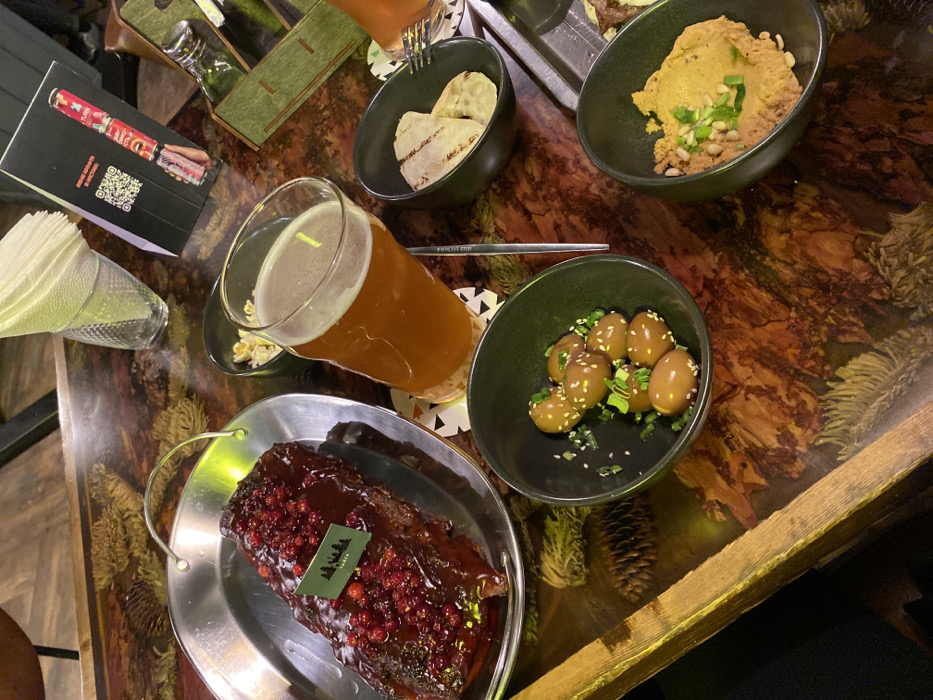 The image depicts a tabletop scene at the "Тайга" (Taiga) restaurant in Irkutsk, Russia. The table surface is a resin or laminate inlay featuring autumn foliage, pine needles, and pinecones. Central to the scene is a silver oval serving tray holding a rack of ribs coated in a glossy dark red sauce and garnished with numerous red berries, possibly cranberries or lingonberries. A small green flag-shaped food pick with a tree logo and the text "Тайга" is inserted into the ribs. To the right of the ribs, a tall glass of amber-colored beer with a thin head rests on a geometric white and black coaster. Surrounding these main items are four small dark bowls: one containing a small quantity of popcorn; another with approximately eight glazed brown quail eggs topped with sesame seeds and chopped green onions; a third bowl containing several flat, toasted bread pieces; and a fourth bowl holding a reddish-brown dip or spread garnished with pine nuts and chopped green herbs. In the upper right quadrant, a clear glass contains several neatly folded white napkins. Adjacent to it, a black menu card or promotional display stands upright, showcasing a stack of red cans labeled "TURN" and a QR code. A small wooden crate or holder with at least one clear glass bottle is partially visible behind the menu. A metal utensil, likely a fork, is visible within the bowl of toasted bread, and a slender metal stir stick lies on the table between the beer glass and the bowl of quail eggs. No individuals are visible, indicating an active dining setting.