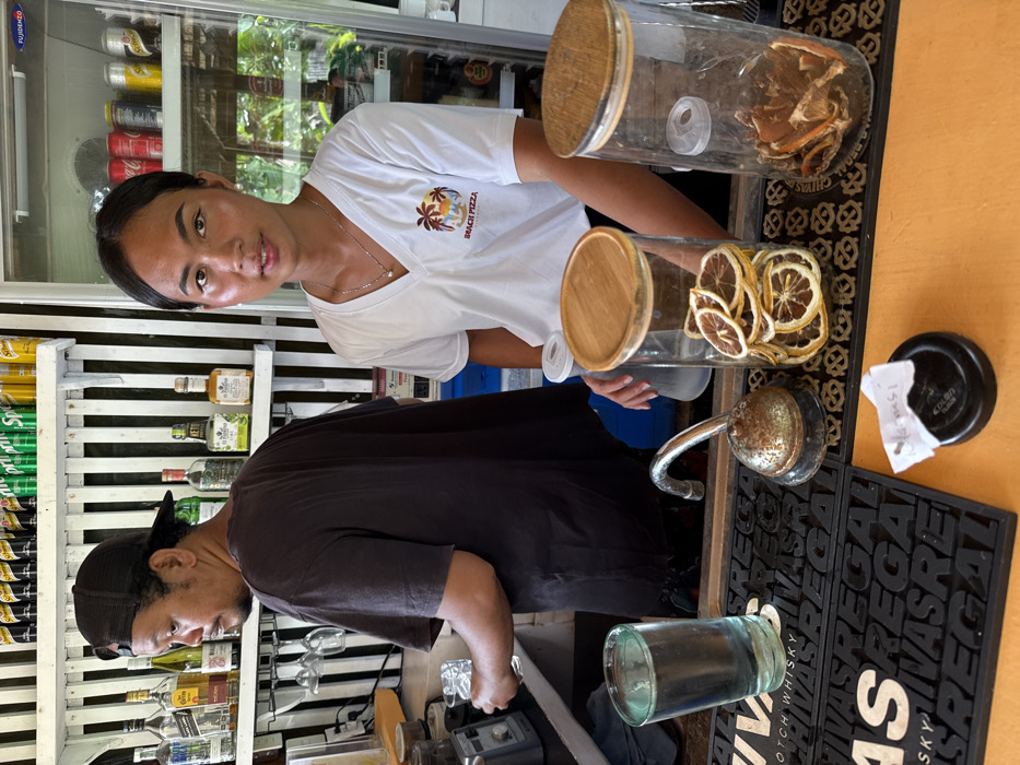 The image portrays an indoor bar area in General Luna, Philippines, featuring two individuals behind a counter