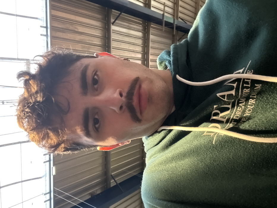 A young adult male is depicted in a close-up, upward-angled self-portrait. He has dark, curly hair, thick eyebrows, and a prominent dark handlebar mustache. His skin tone is fair. A small, gold-colored hoop earring is visible in his right ear. He is wearing a dark green hooded sweatshirt with white drawstrings; the front features partially visible white text reading "DRIANA / ON'T DREAM UR LI[FE] / [L]IVE YOUR DR[EAM]". The fabric of the sweatshirt shows signs of pilling. The background reveals an interior setting with a high, bright ceiling composed of corrugated metal panels and dark structural beams, suggesting a large commercial or industrial space, potentially within the city of Chantepie, France. Bright, diffuse light illuminates the scene from above.