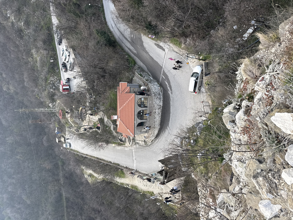 The image presents an elevated, oblique view of a mountain road system in Asenovgrad, Bulgaria, characterized by a significant hairpin turn. Centrally located at the apex of this turn is a single-story building with an orange-tiled hip roof, light-colored walls, and multiple arched window/door openings, set on a stone-walled patio. The asphalt road winds through the scene, with vehicles and individuals distributed across various sections. A silver station wagon is parked on the lower right curve of the road, positioned on the shoulder. In the upper right quadrant, an informal parking area holds approximately five vehicles, including white, black, and grey cars. A red portable cabin and several red-roofed gazebos are situated further up the road, along with a white van. A tall metal power line tower stands on the hillside in the upper left-center. Approximately 20-30 individuals are present. Several people are observed near the central building, some standing on its patio, others appearing to enter or exit. A group is gathered on the road near the silver station wagon. Other individuals are seen walking along the road, congregating near the gazebos, and on a wooden observation platform built into the rocky slope on the lower left. The surrounding landscape consists of steep, rocky hillsides covered primarily by bare deciduous trees, indicating a dormant season. The immediate foreground features rugged rock formations and sparse vegetation. The sky is uniformly overcast.