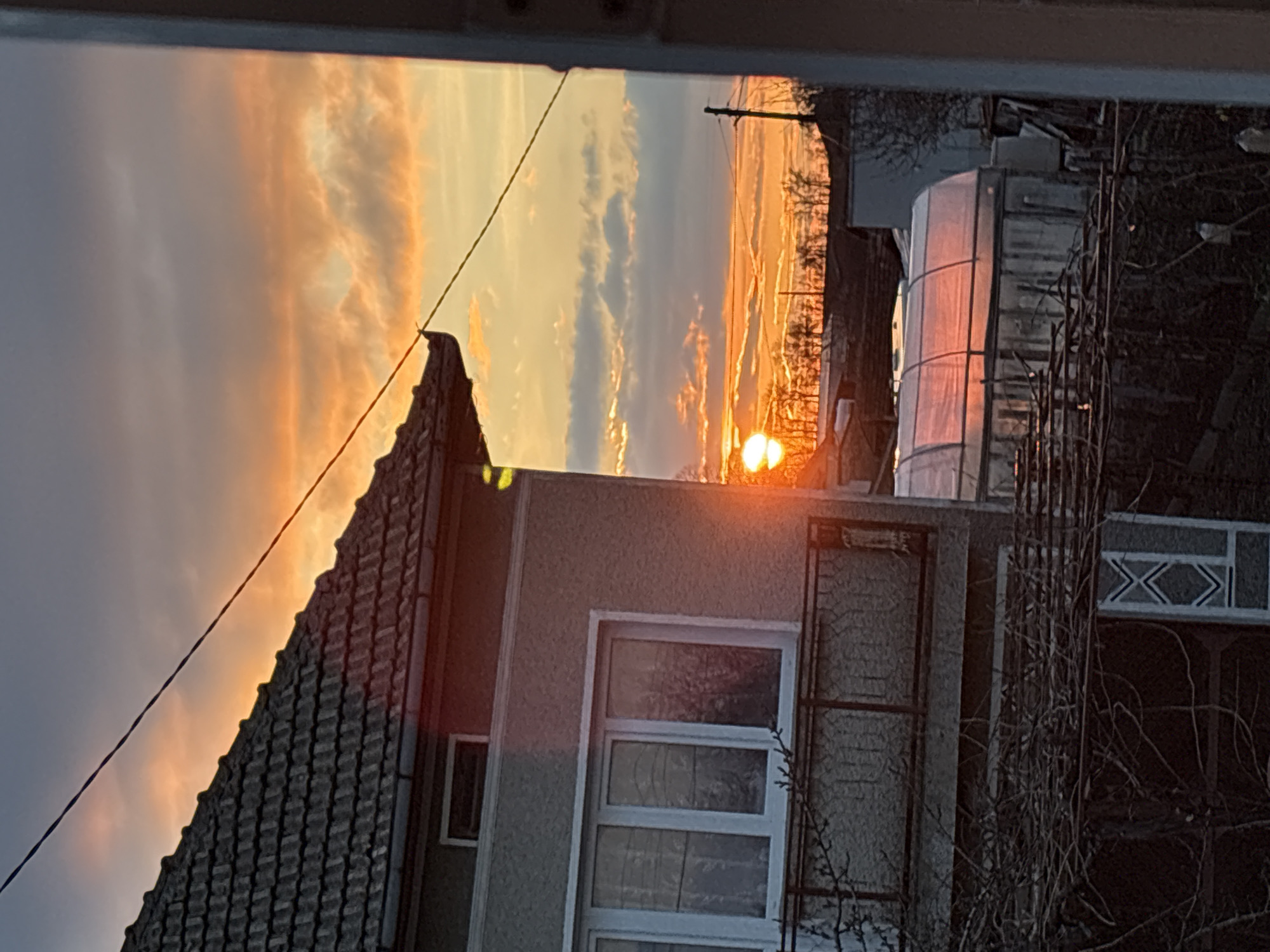 A sunset is viewed through a window frame in Stefan Karadja, Bulgaria. The lower portion of a building with a tiled roof is visible in the foreground. Adjacent to the building is a greenhouse structure, also illuminated by the setting sun. A wire extends diagonally across the frame.