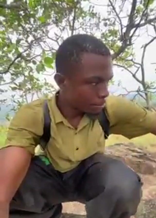 A man with a short haircut, dark skin, and a goatee is squatting on a rock. He is wearing a light olive green short-sleeved shirt, dark gray sweatpants, and a black backpack. He is barefoot. The man stands up and starts to walk toward the camera, smiling. The camera shakes and the man holds onto the branch of a tree as he continues to move. The background shows trees and some buildings. The sky appears to be overcast.
