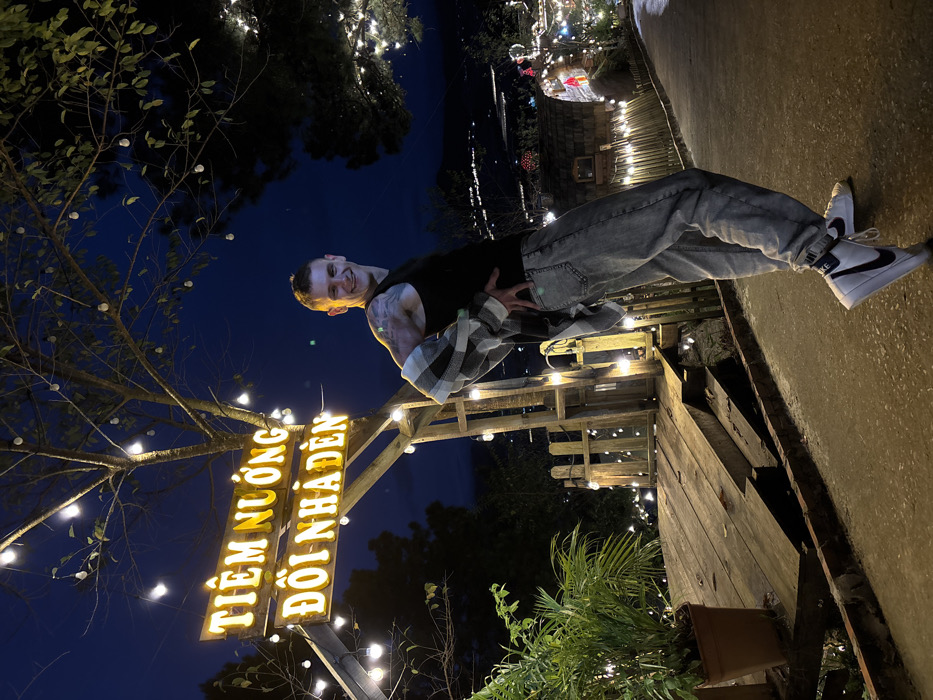 A single male subject poses at night at Tiệm Nướng Đồi Nhà Đèn in Thành phố Đà Lạt, Vietnam