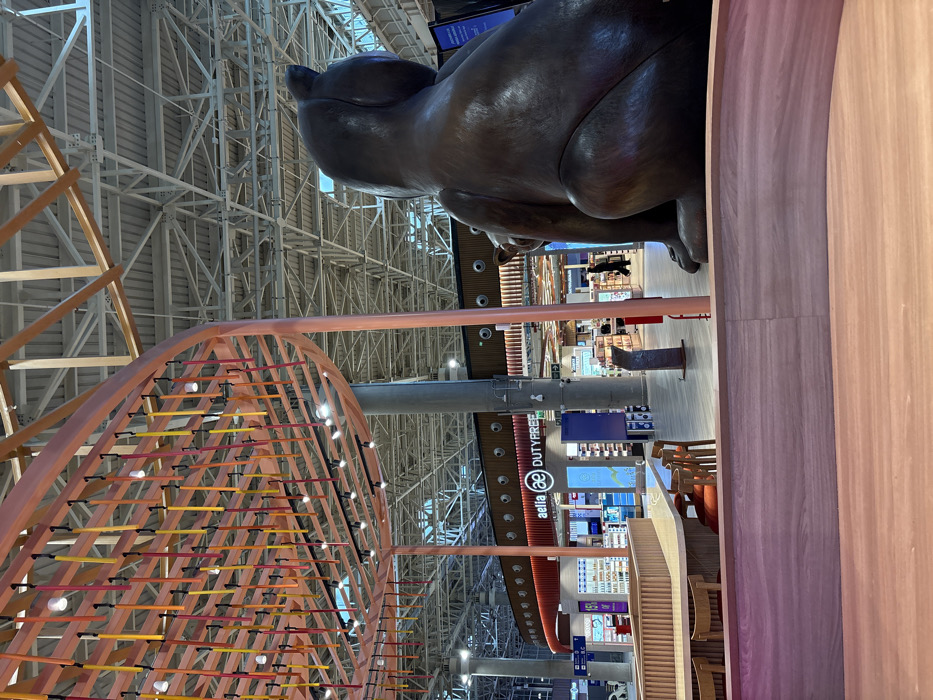 portion of the Jorge Chávez International Airport in Callao, Peru (latitude: -12.029, longitude: -77.116). The scene is a seating area with a wooden table and chairs. There is a large, brown, wooden sculpture of a bear sitting on the floor next to the seating area. The sculpture's back is facing the camera. The seating area is located near a duty-free shop, and the shop's signage can be seen behind the seating area. The seating area is also located under a large, orange and brown wooden structure with hanging orange and yellow cords. The structure's interior is made of metal. The background shows a large, open space with a metal roof. There are several other people walking in the background. The image is taken from the seating area, and the camera is facing forward. The image is taken from the perspective of someone sitting at the table. The lighting is bright. There are no people visible in the seating area.