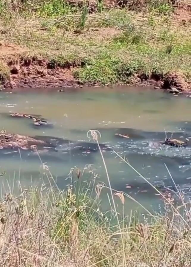 small, slow-moving stream or river with murky, slightly greenish water. The banks of the stream are composed of dirt and grass. There are small rocks and debris visible within the water. In the foreground, there is dry, brown grass and some dried flower stems obscuring part of the view. The scene is bathed in bright daylight.