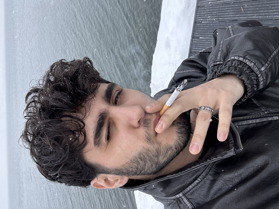 In Tsamakaberd, Armenia, a close-up image captures a young adult male outdoors during snowfall. The subject, positioned centrally, has dark, curly hair and a beard, both flecked with visible snowflakes. He wears a black leather jacket and a silver-toned ring with floral or star-shaped elements on his right ring finger. The male is holding a lit cigarette, which has a visible ash column, between his lips with his right hand. He is winking with his left eye. The background features a large, choppy gray body of water, likely Lake Sevan, under an overcast sky. A snow-covered surface, possibly a pier or deck, with dark wooden slats partially visible underneath, occupies the lower right portion of the frame, separating the subject from the water.