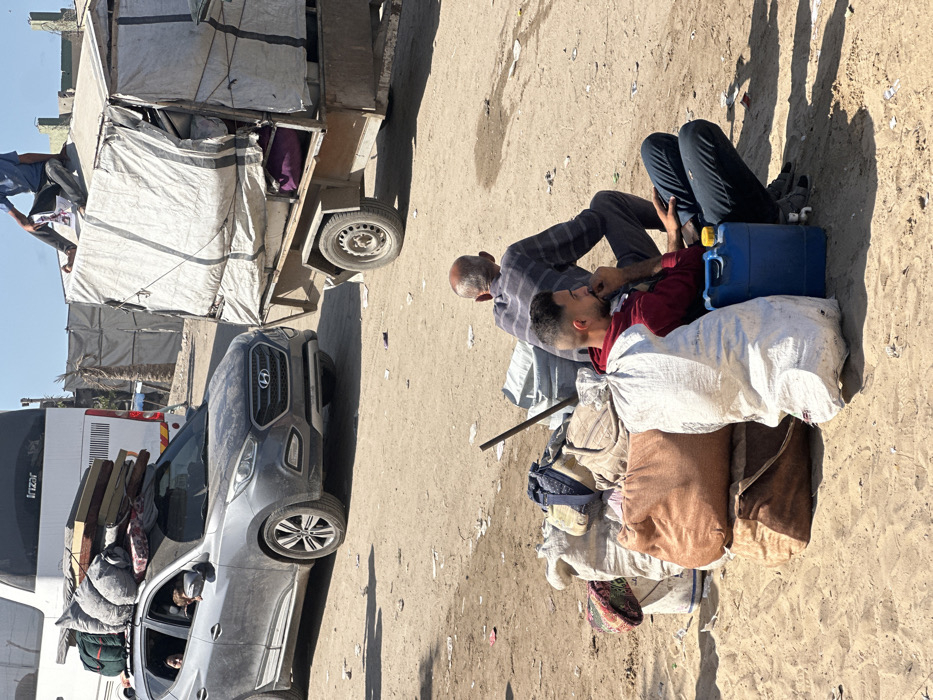 The image depicts a crowded outdoor scene in Jazirat an Nasirat, Unknown, under bright daylight. In the foreground, two men are seated on dusty, sandy ground littered with debris. The man closer to the viewer is younger, with a trimmed beard, wearing a maroon hoodie and dark pants, sitting with his right hand near his face. He leans against a large white sack. Next to him is a blue jerrycan with a yellow cap and a white tap. Behind him, an older, bald man in a striped shirt and dark pants is seated facing away from the camera. Around them are piles of various sacks and belongings, including a large brown sack, several lighter-colored sacks, and a patterned hat on top of a fabric pile. A dark pole is visible among the items. In the midground, a dark grey Hyundai Tucson SUV is positioned slightly to the left, heavily loaded with possessions on its roof rack, including multiple mattresses, blankets, and bags secured by ropes. A person's head is visible through the open front passenger window, and another through the open rear passenger window on the driver's side. To the right of the SUV, a grey, open-top trailer, loaded and covered with a light-colored tarpaulin, is visible. A purple fabric item is discernible inside the trailer. A man in a blue shirt and dark pants sits on the roof of this trailer, facing away from the camera. In the background, a white passenger bus with "Inzar" written on it is partially visible behind the SUV. Further back, there are various makeshift structures or shelters constructed with tarpaulins and light fabrics, along with sparse vegetation and palm trees, suggesting a temporary settlement or camp. The sky is clear blue.