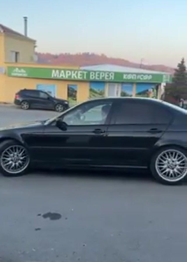 black BMW E46 sedan parked on the side of a road. The car has aftermarket wheels. Behind the car is a yellow building with an attached store. The store's sign is in Bulgarian and translates to "Market Vereya Konkosor". The sky is clear and blue.