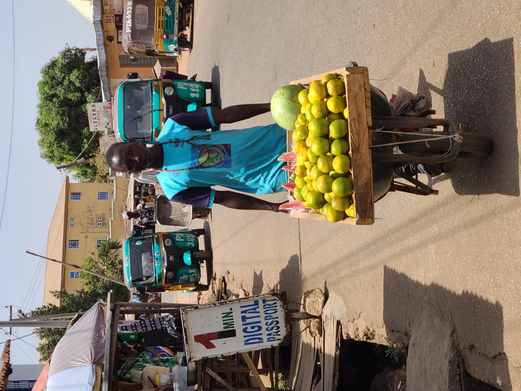 The image depicts a street scene in Jos, Nigeria, under bright sunlight. A dark-skinned male, appearing to be in his 20s or 30s, is positioned slightly right of center, walking forward and pushing a single-wheeled cart. He wears a light blue t-shirt with dark blue sleeves and collar, featuring a graphic print and a wooden beaded necklace. The cart, a modified wheelbarrow, is laden with produce. A large pile of green and yellow oranges forms the base, topped by a whole green watermelon and visible slices of watermelon to the left. The cart has a single worn tire. To the immediate left, a rustic roadside stall with a brown and white striped umbrella provides shade. A white sign, propped up by rocks, reads "1 MIN. DIGITAL PASSPORT" in red and blue lettering. Exposed wooden planks and dirt are visible beneath the stall. In the mid-ground, an teal and yellow motorized tricycle (keke napep) with a partial license plate "PTA-HS1" is visible behind the central figure. Another similar tricycle, partially obscured, is further down the asphalt road, bearing license plate "PTA-G738." A person pushing a gray wheelbarrow is also present in the background. The background features several buildings, including a yellow multi-story structure with blue-framed windows. A prominent green tree stands in the center-right background, behind which is a sign for "NAZEER ALBARKA COSMETICS." Overhead power lines and utility poles are visible against a clear sky. The asphalt road shows wear, and strong shadows indicate direct sunlight.
