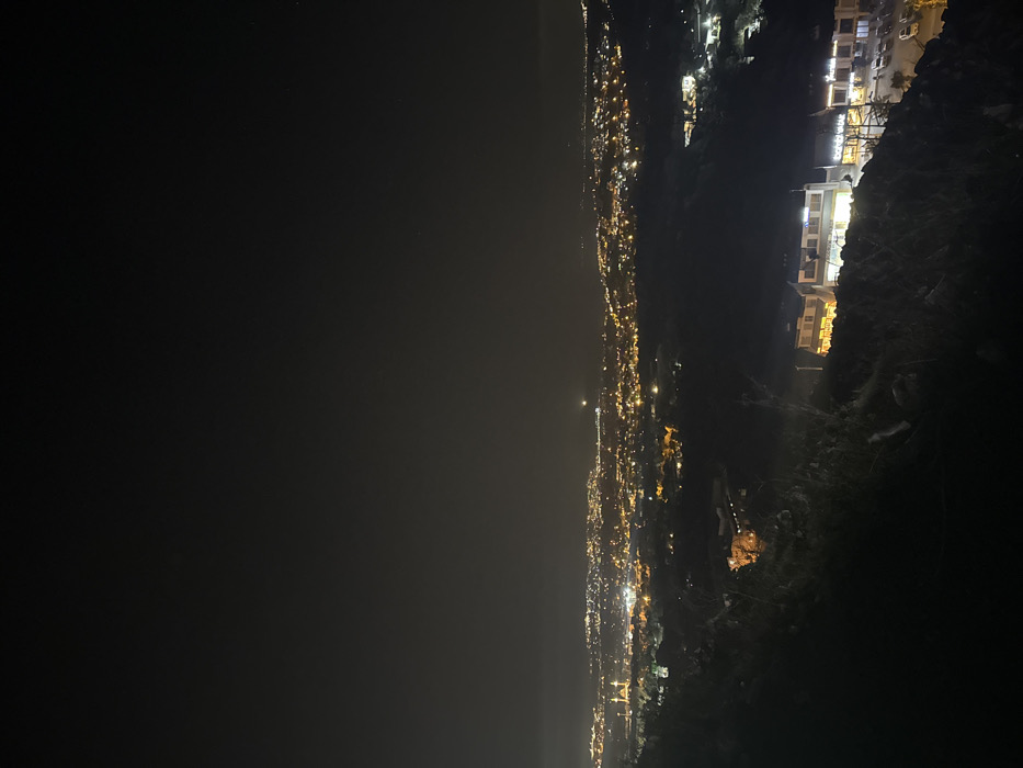 This image depicts a nighttime panoramic view of Bodrum, Turkey, observed from a elevated vantage point. The upper two-thirds of the frame are occupied by a dark, clear night sky, with a faint haze visible directly above the city lights. The lower third of the image consists of dark, undifferentiated foreground terrain, characteristic of a hillside with minimal visible detail such as rocks or sparse vegetation, silhouetted against the illuminated urban area. The midground and background showcase the sprawling city of Bodrum, densely illuminated by numerous artificial lights. These lights are predominantly warm-toned (yellow and orange), outlining streets, residential structures, and commercial buildings. Brighter white lights are also discernible within the urban grid. In the mid-left section of the cityscape, a prominent mosque is identifiable by its two tall, brightly illuminated minarets. In the lower right of the image, a distinct, multi-story commercial complex is brightly lit, displaying visible signage, including "Karia Vatana" and "Bodrum Vatan." An adjacent parking area with several parked vehicles is visible. The city's illumination extends towards the horizon, where it meets a darker expanse indicative of the Aegean Sea. A singular, bright circular light source is visible above the distant city lights on the horizon, potentially a celestial body or a powerful distant light source. No human figures or specific actions are discernible within the frame.