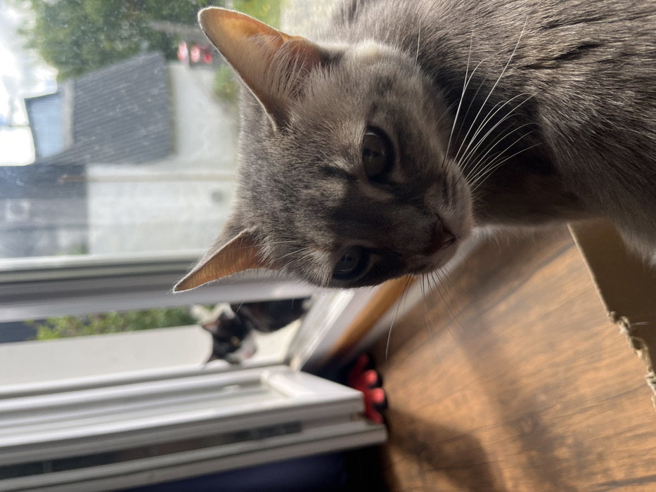 - "A gray tabby cat peers down towards a white-framed window" by FM-rplFE3, licensed under CC BY 4.0