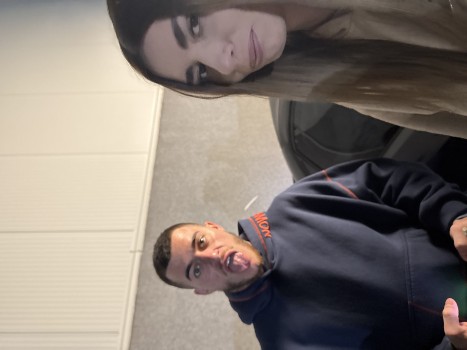 The image depicts two individuals, a male and a female, situated in what appears to be an indoor or sheltered outdoor area in Sliven, Bulgaria. On the left, a male with short dark hair and a light beard is visible from the chest up, facing the camera directly. He is wearing a dark blue hooded sweatshirt with orange trim and "NOW" text around the collar. His mouth is open, and he is actively sticking his tongue out towards the viewer. A ring is visible on his right hand, and he appears to be holding a mobile device emitting a green light with his left hand, mostly out of frame. To the right, partially behind the male and slightly obscured by the frame, a female is visible from the chest up. She has long, light brown hair and is wearing a light brown hooded sweatshirt. Her head is slightly turned to her right, and her expression is neutral, with her lips slightly pursed, looking away from the camera's direct gaze. The background consists of a light gray concrete-like wall in the lower half, topped by a white paneled wall section. A dark-colored vehicle, possibly a sedan, is partially visible behind the female on the right, reflecting light on its surface. The lighting is artificial and relatively dim.