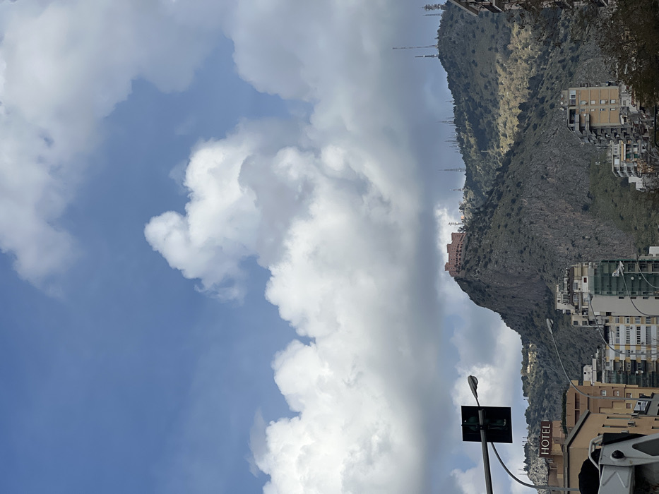 This image depicts a panoramic view of an urban area in Palermo, Italy, dominated by Monte Pellegrino in the mid-ground and background. The sky is partly cloudy, with large white and grey cumulus clouds set against a light blue backdrop. Monte Pellegrino, a prominent mountain, features steep, rocky grey slopes with sparse green vegetation. Near its summit on the left, a large, multi-story building with a pink or terracotta facade is visible. The mountain's ridge extending to the right is densely populated with numerous communication and antenna towers of varying designs and heights. In the foreground, urban elements are present. At the bottom left, a partial view of a white vehicle's structure is visible. Above this, a multi-story light-colored building displays a dark "HOTEL" sign. A black traffic light signal box, appearing to be in an off or dark green state, and a grey street lamp on a pole extend into the frame from the left, positioned above the hotel. Below Monte Pellegrino, a dense array of multi-story residential or commercial buildings, exhibiting beige, light grey, and other muted tones, populate the city landscape. No individuals, specific actions, or interactions are discernible.