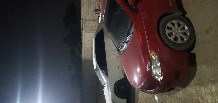 Two cars are parked side-by-side. The front car is maroon, angled towards the viewer, with a visible headlight and tire. The rear car is white and partially obscured, showing only the front portion and a tire. Both are parked against a background featuring a wall of gray, rectangular blocks. To the left, a dark, almost black area suggests night or deep shadow. The scene is dimly lit, highlighting the cars' surfaces.