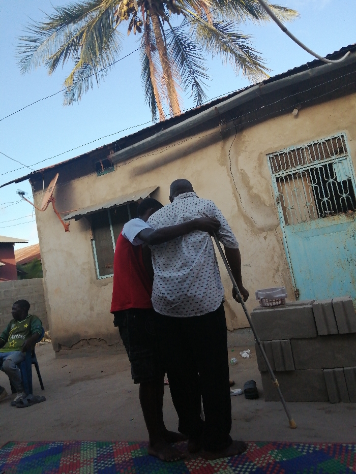 Two men embrace in front of a weathered, one-story building with a corrugated metal roof. The man on the right uses a crutch. A palm tree towers in the background against a clear sky. A seated man watches from the left. Cinder blocks, a basket, and scattered footwear are visible. The scene takes place on a woven mat in what appears to be a backyard setting.