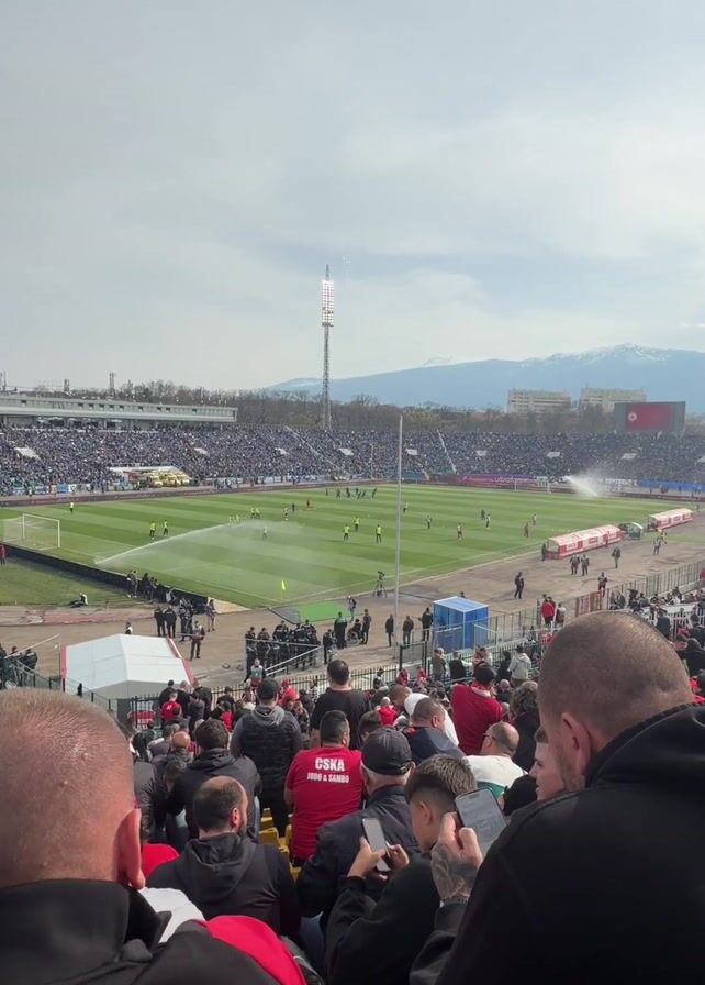 A stadium is packed with spectators watching a soccer game. Players in blue and white uniforms practice on the green field. Staff in yellow vests oversee the warm-up drills. Sprinklers water the field. The camera focuses on a young staff member in a neon vest marked “CSKA”. A person in red and white shorts runs past him. The stands are full. Mountains are visible in the distance.