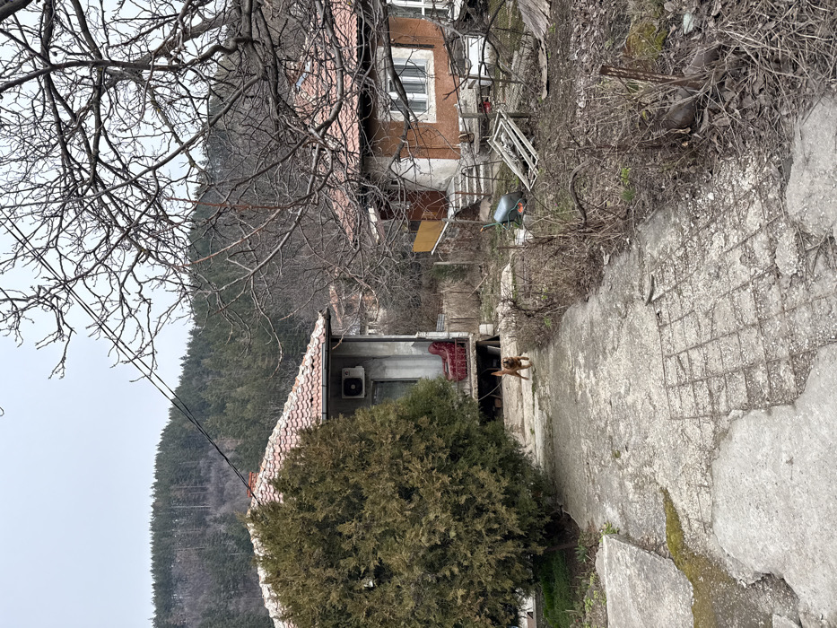 An outdoor scene in a residential area of Sofia, Bulgaria, is depicted under an overcast sky. A cracked concrete pathway, showing sections of exposed wire mesh, extends from the foreground into the midground. To the left, a large, dense evergreen shrub partially obscures a two-story house with a light grey facade and a red-tiled roof. An air conditioning unit is mounted on the upper wall of this house, and a red upholstered armchair is visible on an open lower-level porch. A light-brown dog stands on the concrete path, facing the viewer, in front of the grey house. To the right, a smaller, single-story house with a brown facade, white-framed windows, and a red-tiled roof is present, featuring an external staircase. The yards surrounding both houses are unkempt, containing dry vegetation, bare tree branches, a green wheelbarrow, and discarded white window frames. Two black utility lines traverse the upper midground. The background is dominated by a steep, densely forested mountain covered in coniferous trees, beneath a uniformly grey, cloudy sky. No individuals are visible.