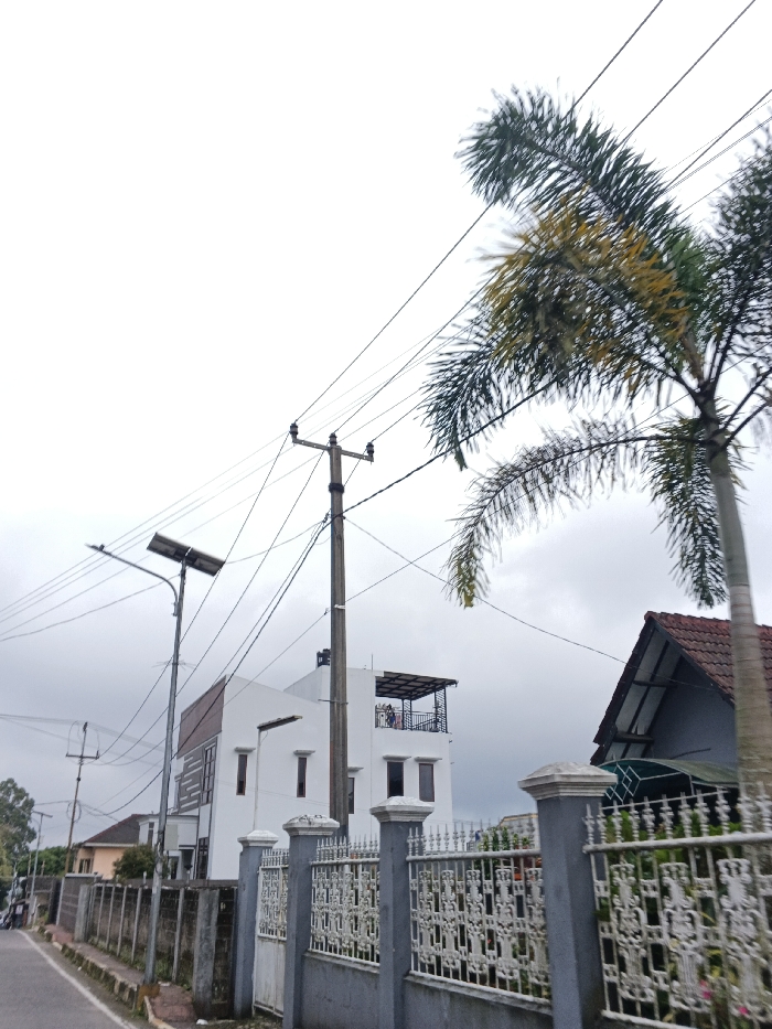 This image captures a street scene in Bhimad, Nepal, under an overcast sky. In the foreground, a decorative white metal fence with grey concrete posts and a low wall spans the right side, partially obscuring a building with a red-tiled roof and a green canopy. A palm tree with green and yellowish fronds occupies the upper right. Centrally, a prominent three-story white building features multiple dark-framed windows and a top-floor terrace or balcony where at least two indistinct individuals are visible. To the left of this building, a tall wooden utility pole supports multiple cross-arms and numerous overhead electrical or communication wires that extend across the frame. Further left, a metal street light pole with a mounted solar panel is visible, also with attached wires. A paved road runs along the left side, bordered by a raised curb and a narrow dirt verge. In the far distance on the left, another building with a reddish-brown exterior is partially visible, and a person on a two-wheeled vehicle (motorcycle or scooter) is moving away down the street. The overall lighting is diffuse, indicative of a cloudy day.