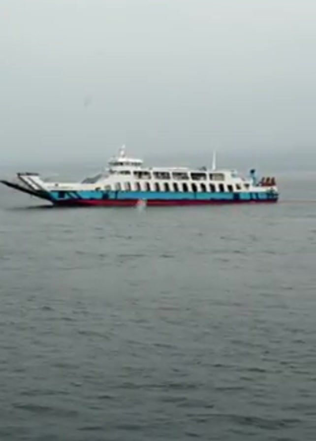 large ferry traveling across a body of water on a cloudy day. The ferry is white with blue and red accents. As the video progresses, the ferry moves further away from the camera, eventually becoming a small object in the distance. The water is choppy, and the sky is overcast.