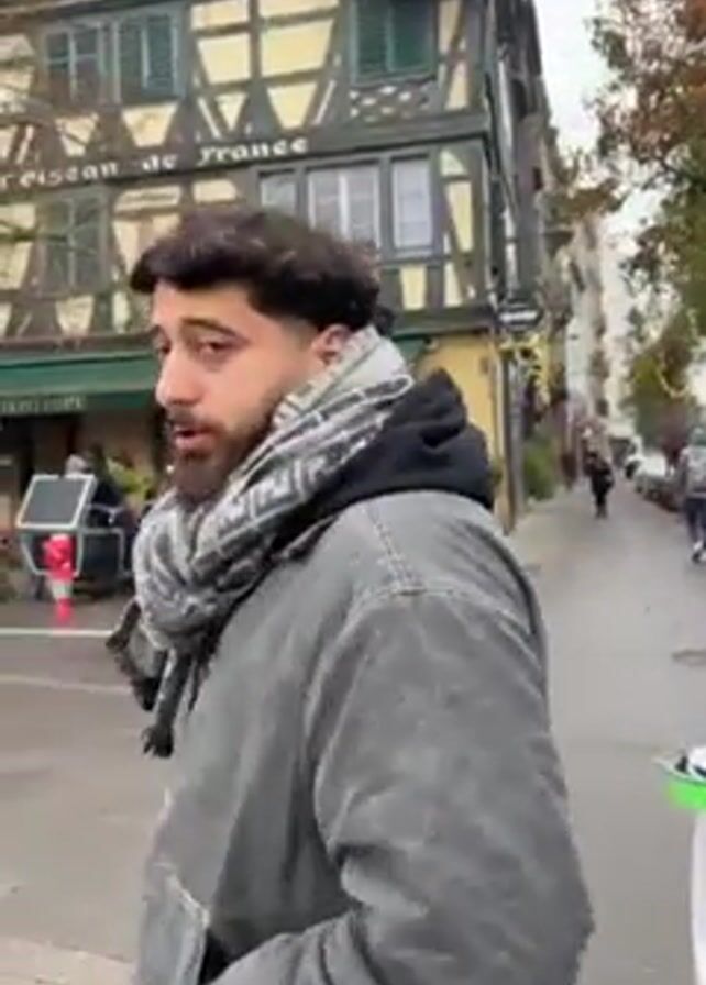 A man stands on a sidewalk, near a pole with a pedestrian crossing signal and a trash bin. He is dressed in a gray jacket and scarf. He is looking at the camera and speaking. Behind him is a tan and brown timber framed building with green shutters. Other people and a bicycle are also on the sidewalk. The day seems overcast.