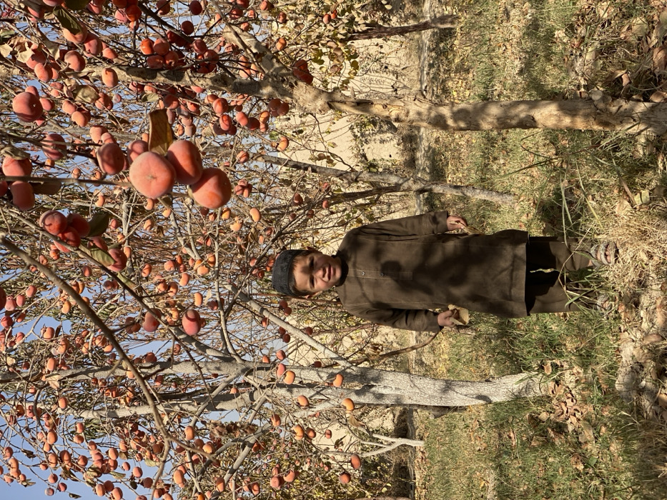 - "A young boy in a dark brown suit and black cap stands among persimmon trees laden with orange fruit" by FM-B5wmg2, licensed under CC BY 4.0