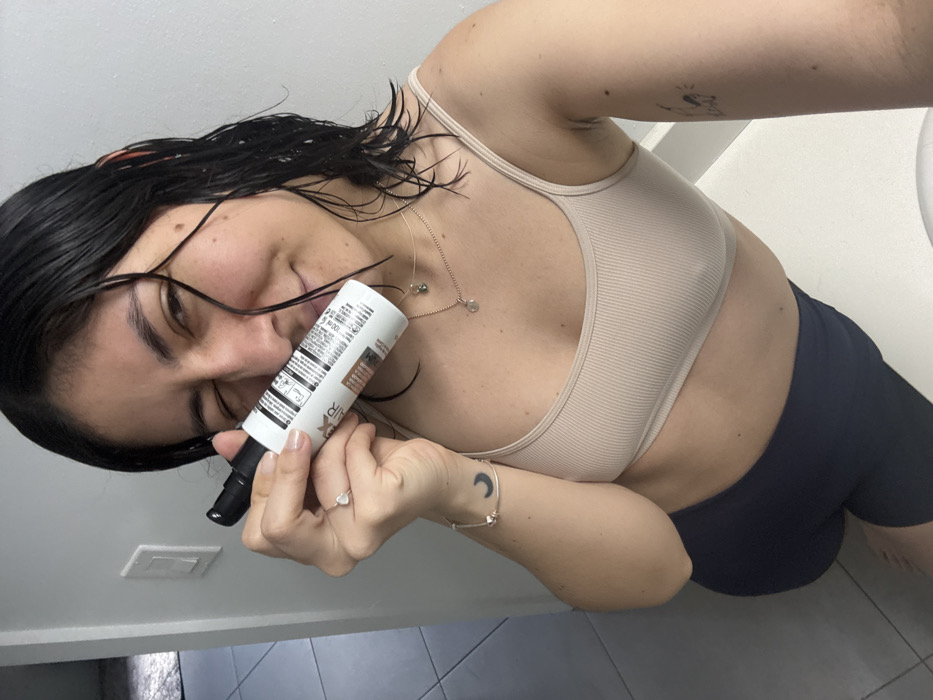 A female subject, appearing to be an adult, is depicted indoors within a private residence in Miami, United States, likely a bathroom or bedroom. She has dark, wet hair and is winking with her right eye, smiling directly at the camera. She wears a light beige ribbed sports bra and dark blue athletic shorts. Her left hand holds a white spray bottle with a black pump dispenser, displaying visible text including "HAIR" and "100 ml," along with other illegible instructional icons and text. On her left wrist, a silver bangle bracelet with a black crescent moon design is present, and a ring with a white heart-shaped stone is on her left ring finger. She also wears two layered necklaces with small pendants and has a small, minimalist tattoo on her upper left arm. The background consists of a plain light-colored wall with a white light switch. A partially visible doorway on the left reveals a light-colored tiled floor and a dark rug or mat.