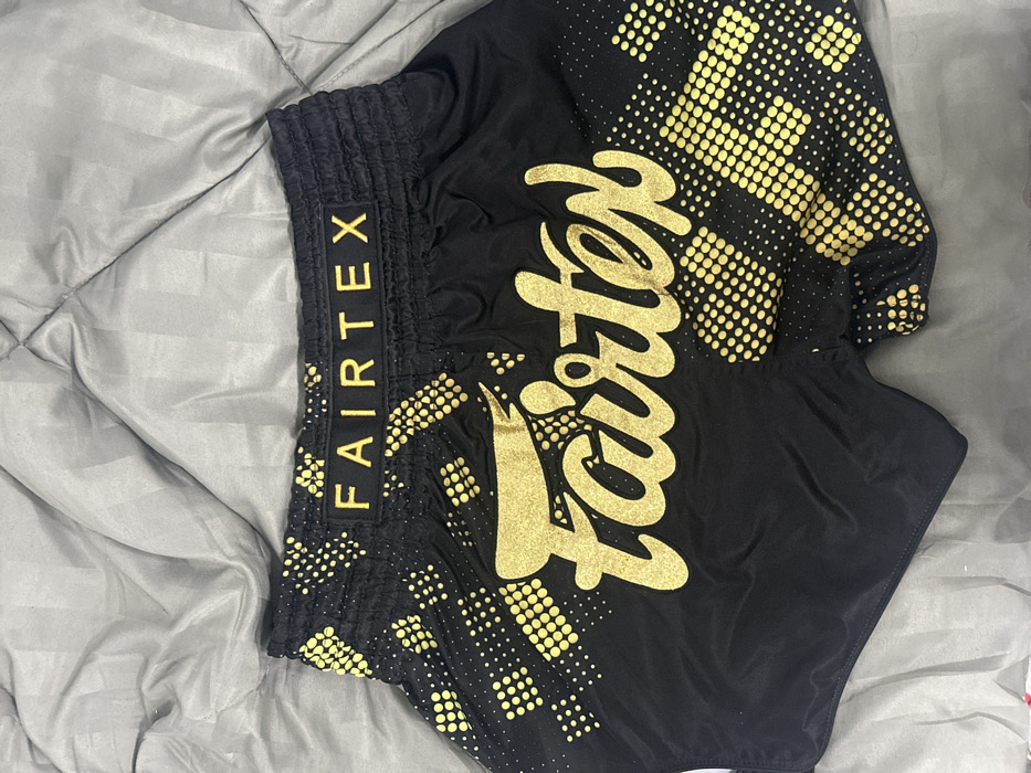- "Black Muay Thai shorts with gold lettering "Fairtex" vertically on the waistband and in large script across the front of the shorts" by FM-kJKYr1, licensed under CC BY 4.0