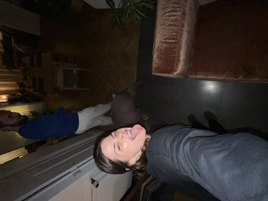 Four people are visible in a skewed, dimly lit indoor shot. One man lies on his back in a blue sweater and white pants. Closer, another person wears brown clothing, possibly pants. The person taking the photo is wearing a black sweater and sticks their tongue out. A couch is visible in the upper-right corner. A plant and a small white table are also visible in the background. The floor is dark, and some feet can be seen near the couch.