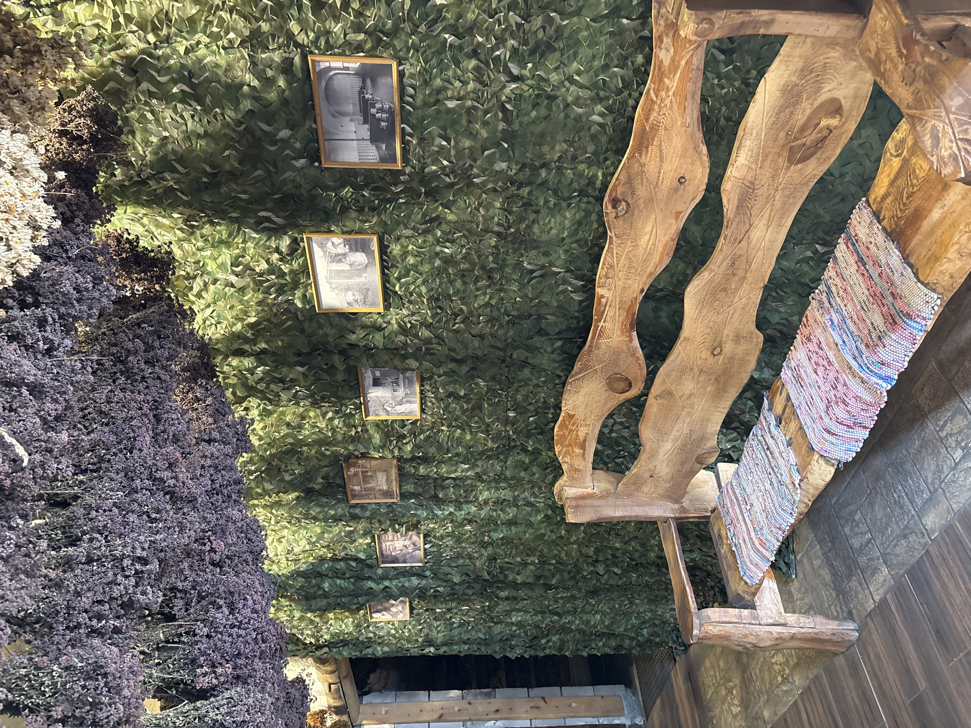 This image displays an interior space within Bely Klyuch, Russia. The ceiling is densely covered with bundles of dried, purple-hued flora, interspersed with lighter-colored dried plant material. A vertical wall is entirely clad in a textured green material, resembling camouflage netting or artificial foliage. Five framed black-and-white photographs are horizontally mounted on this green wall. From left to right, these images depict: an indistinct scene, a person within an interior, an interior view with various objects, an interior featuring multiple vessels, and an arched room containing several metal buckets or basins. In the foreground, a substantial, light-toned wooden bench is present, characterized by a naturally contoured, undulating backrest and armrests. Two rectangular, multicolored woven textile mats are placed on the bench's seating surface. To the far left, a dark wooden-framed doorway opens into a recessed, dimly lit passage with visible steps. The floor is composed of large, rectangular dark grey tiles.