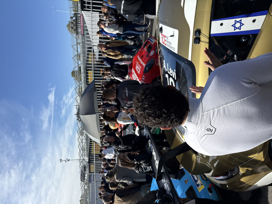 The image depicts an outdoor scene at the Autodromo Nazionale Monza in Monza, Italy, characterized by a bustling motorsport event under a bright blue sky with scattered white clouds. In the immediate foreground, from a rear perspective, an individual with dark, curly hair is visible, wearing a light-colored, long-sleeved athletic shirt with a black logo on the collar. Their hands are raised and slightly open, suggesting a clapping or gesturing motion. Directly in front of this person is the rear section of a gold-colored race car, which features black and white livery accents. A distinct decal resembling the flag of Israel—a blue Star of David centered on a white stripe, flanked by two horizontal blue stripes—is affixed to the rear side window of this vehicle. Two small, black electronic devices are mounted on the car's rear window. In the midground, a substantial crowd of approximately 30 to 50 individuals is gathered. Central to this group is a red prototype or GT race car, partially visible, bearing sponsor decals including "ICON" and "Sam's Geldscheine." Standing near this red car is a person in a white and blue racing suit, holding a helmet, seemingly engaged in conversation with another individual dressed in dark attire. A large black umbrella is held open, providing shade over a portion of this interaction. To the left, a section of a blue race car, displaying "PORSCHE" and "MICHELIN" branding on its rear wing endplate, is visible. Members of the crowd are standing, observing the vehicles and individuals, with some engaged in conversation. One person on the left is holding a microphone or recording device. The background features typical race circuit infrastructure, including metal grandstand structures, safety fencing, and tall utility poles equipped with lights. A banner with the text "MASCOT WORKWEAR" is faintly discernible on one of the fence structures.