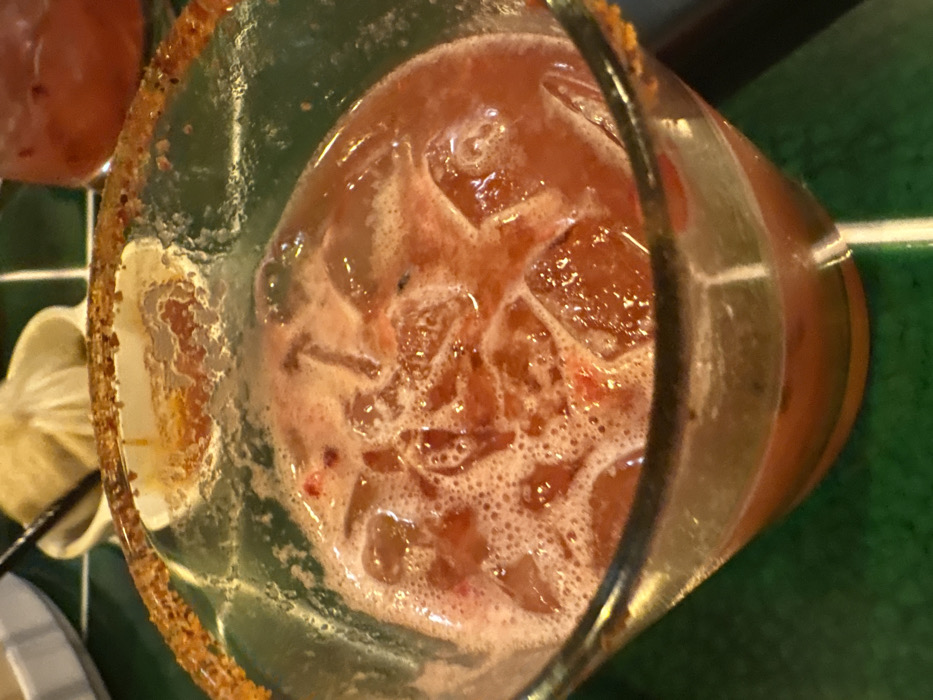 An overhead shot shows a glass of a red liquid, likely a cocktail, filled with ice cubes. The rim of the glass is coated with a granular, orange-brown substance, perhaps chili powder or a similar spice. A wedge of citrus fruit is clipped to the side. The drink is garnished with small red particles. The background is a blend of blurry surfaces, including a green-tiled area.