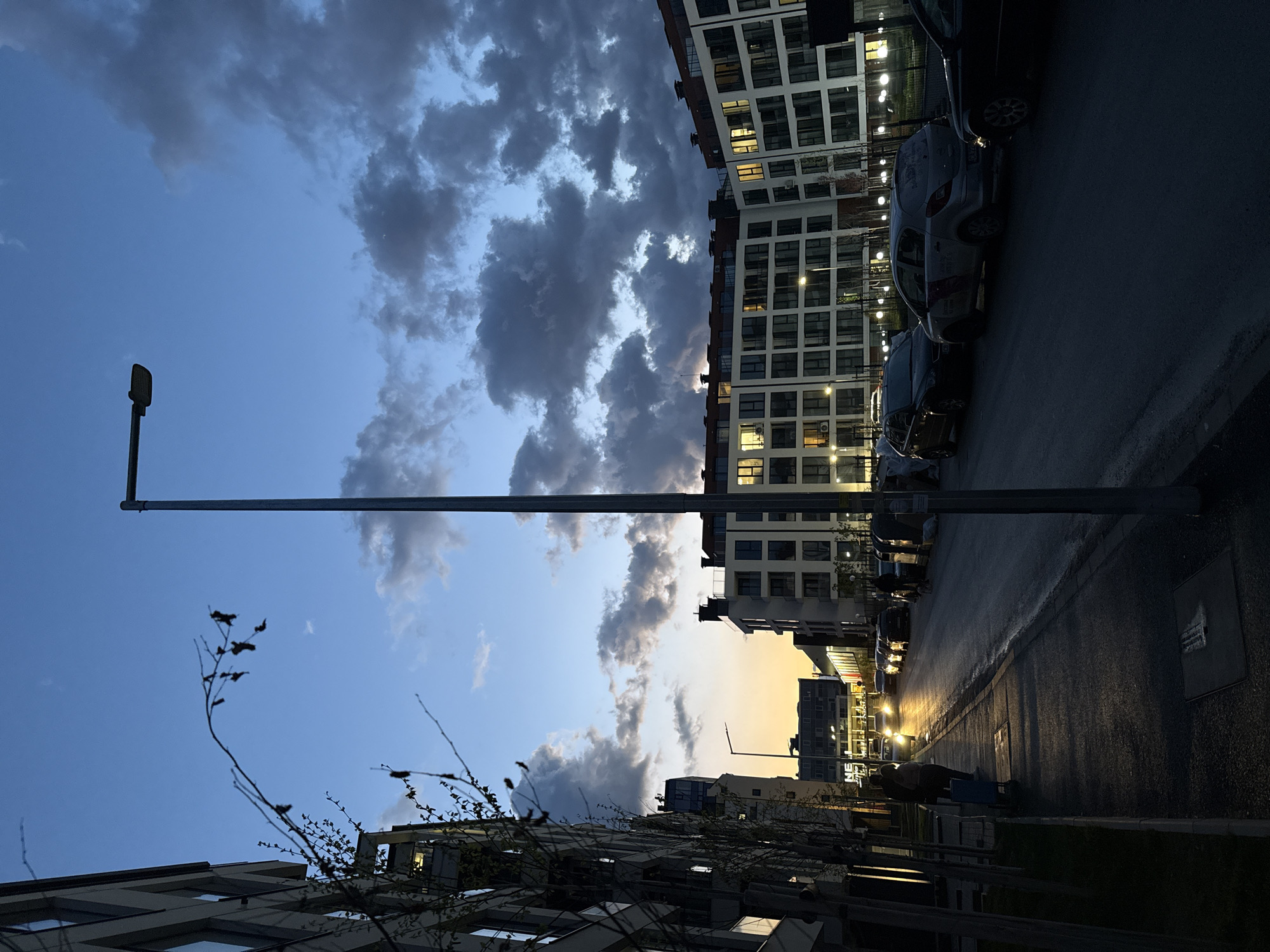 n urban street scene at dusk. The sky is a gradient of blue to orange, with dark clouds overhead. A tall street lamp extends horizontally across the frame. A modern, multi-story building with numerous lit windows lines one side of the street, with parked cars along the curb. The street is dark and slightly wet. On the other side of the street are lower buildings with trees in front. The location is likely in Sofia, Bulgaria, given the architectural style.