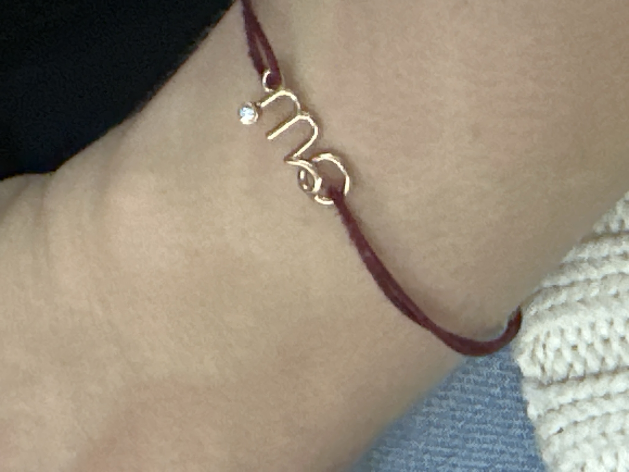 A close-up shot shows a person's wrist adorned with a maroon string bracelet featuring a gold-colored charm that resembles the Virgo astrological symbol