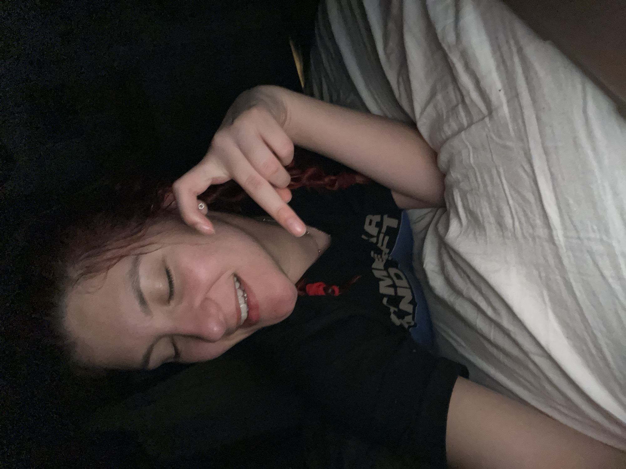 A young woman with reddish-brown curly hair is lying in bed. Her head is angled to the left of the frame. She is smiling with her eyes closed. She is wearing a black t-shirt. Her right hand is raised, with her index and middle fingers pointed downward. The background to the left is dark and indistinct. To the right, a light-colored sheet is visible. The location is not discernible from the image.
