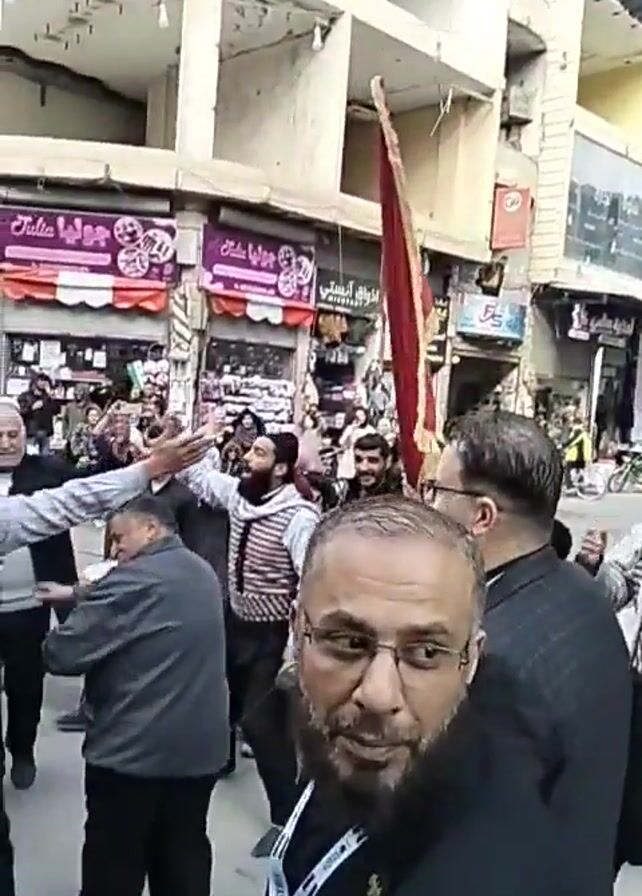 crowd of men dancing in the street, celebrating. Several men are carrying flags, one red and one white. Some of the men are wearing vests and suits, while others are in casual clothing. The celebration is taking place on a street lined with shops. Some of the buildings are damaged. The men appear to be Middle Eastern, based on their clothing and appearance. The video is shot from the perspective of someone in the crowd, moving along with the group.