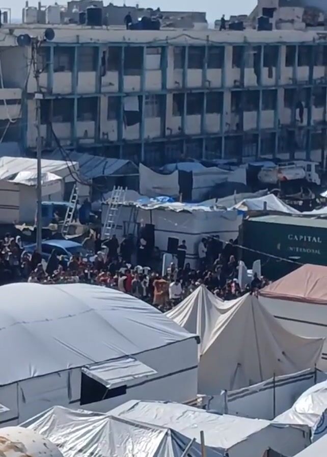 n overview of a densely populated area with numerous white tents and makeshift shelters crowded together. In the background is a large, multi-story building with a visible level of disrepair, including broken or missing windows and visible damage to the structure. A large crowd of people is gathered in a central area between the tents and the building. Several ladders and vehicles are present, suggesting ongoing activity or movement of people and supplies. The overall impression is of a displaced or refugee community living in temporary housing, with clear signs of the area being affected by conflict or disaster.