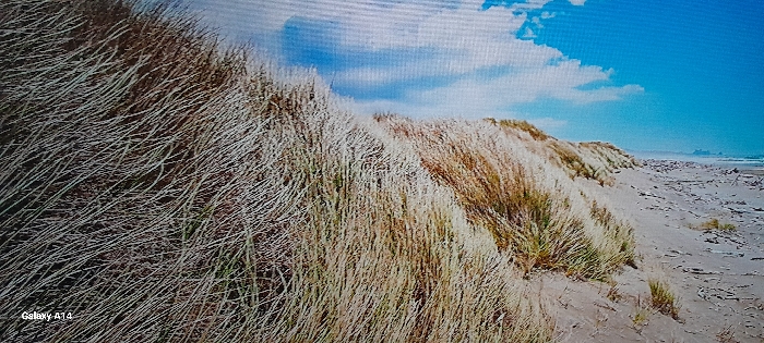 The image displays an expansive outdoor scene of a sandy coastal environment under a bright blue sky with sparse white cumulus clouds. In the foreground and midground, a series of irregular sand dunes are prominent, densely covered with long, dry grasses exhibiting variations in color from pale tan to golden brown, with some patches of greener vegetation. The grass appears wind-affected, generally oriented towards the right side of the frame. To the right of the vegetated dunes, a wide, flat sandy beach stretches towards a body of water, presumably an ocean, visible in the distant background. The beach surface contains scattered dark debris, consistent with driftwood. A faint landmass or rock formation is visible on the distant horizon line. No individuals, animals, or artificial structures are present within the scene, except for a "Galaxy A14" watermark in the lower-left corner. The depicted coastal landscape is geographically inconsistent with the inland location of Tinaquillo, Venezuela.