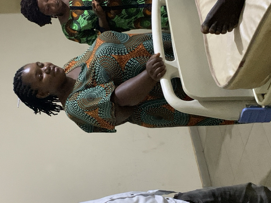A woman in an orange and turquoise patterned dress sits holding onto the handle of a portable chair. Above her, a second woman with short dark hair wears a green and orange patterned dress. A bare foot is visible atop the portable chair. The scene appears to be indoors, with a plain beige wall behind the women. An untidy pile of clothes is visible near the bottom of the frame.