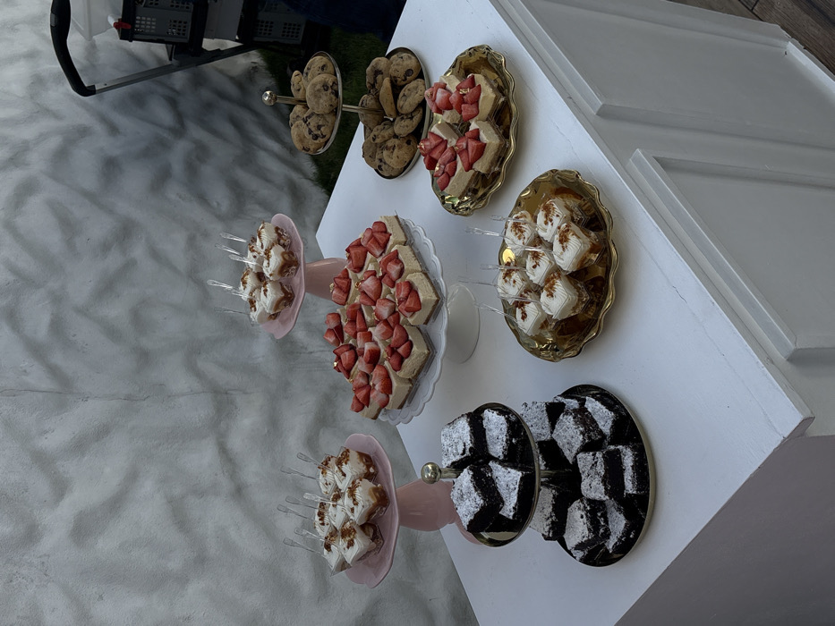 The image displays an assortment of desserts arranged on tiered stands atop a white display