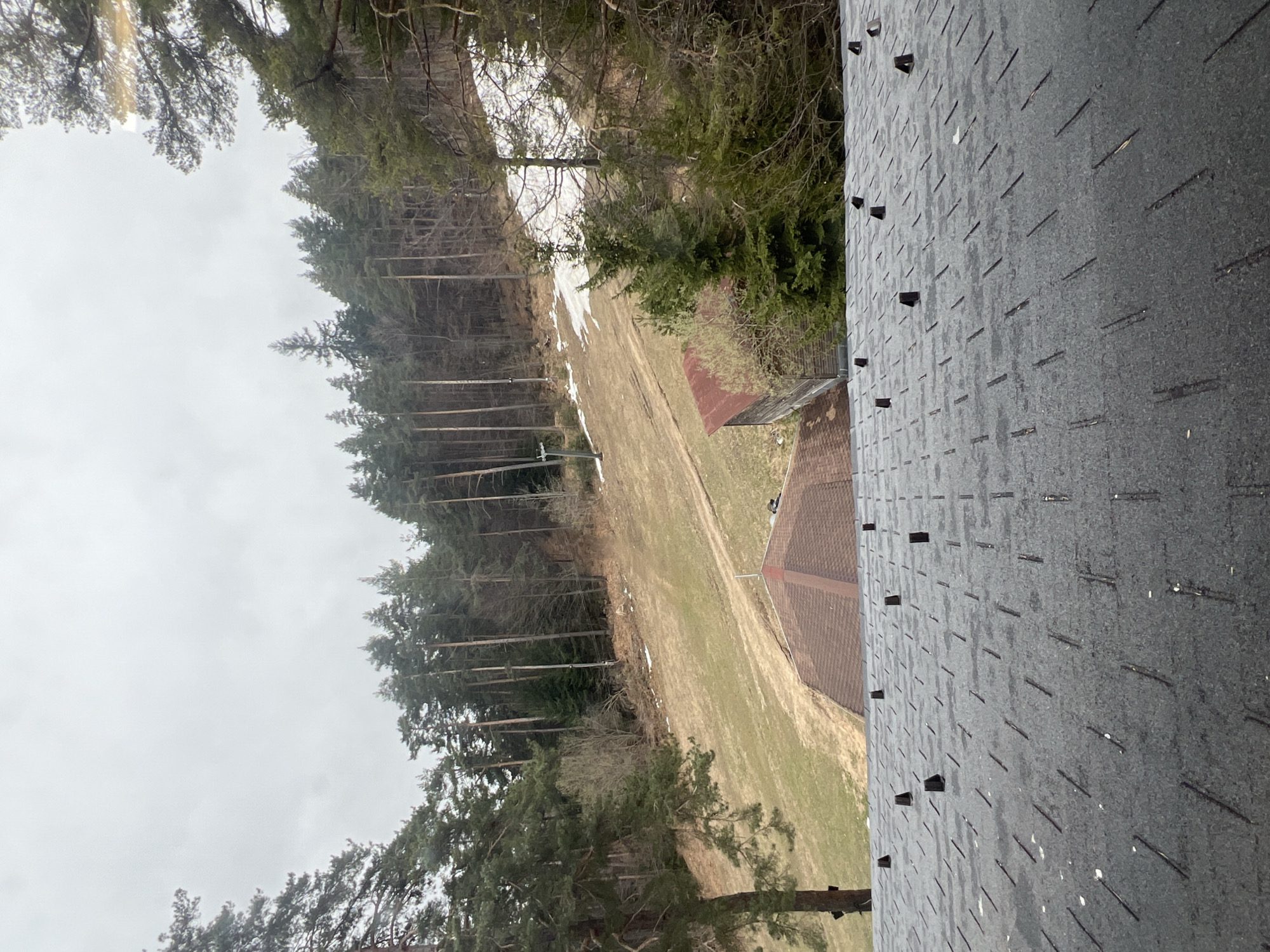 view from a rooftop covered in dark grey asphalt shingles with horizontal markings and small black protrusions. In the background, there's a clearing with a mix of grass and bare ground, indicating a transitional season (likely spring or fall). Patches of snow are visible on the slopes. A building with a reddish-brown roof is also in the frame. The background is dominated by trees, which suggests a wooded area. The overcast sky implies a cloudy day. Based on the prompt the location is Dedovo, Bulgaria.