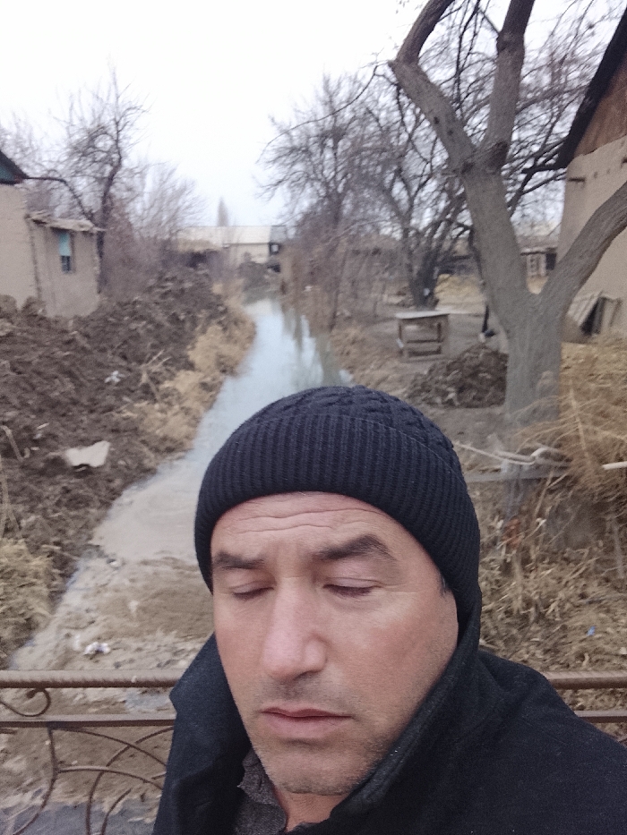 The image displays a male subject in a close-up selfie format, positioned in the foreground against a semi-urban outdoor setting in Qoraqosh, Uzbekistan
