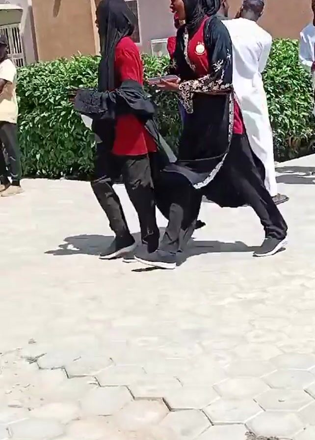 group of people gathered outside a building. Some are dressed in traditional clothing, while others are wearing casual attire. The camera pans across the scene, capturing the faces of the individuals and the building's exterior. There are trees and shrubs around the building. People are talking and interacting with each other. Two women in red and black outfits walk by. Someone is taking a picture of them. Some men are standing near a railing talking.