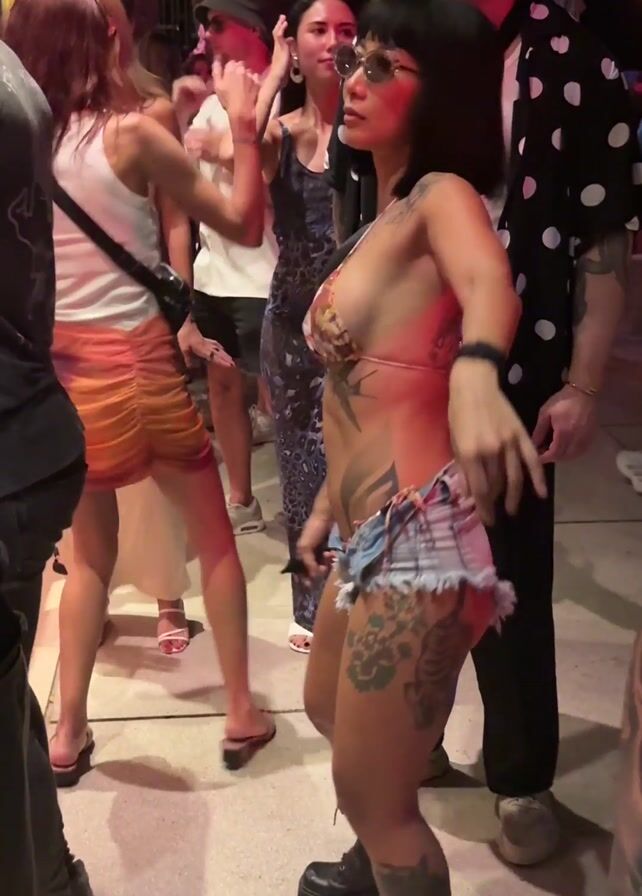 woman with a short, black bob haircut, wearing a floral bikini top, distressed denim shorts, and black combat boots, dancing in a crowded outdoor setting. She has several tattoos on her arms, legs, and torso. She wears glasses and a smartwatch on her left wrist. Other people surround her, some dancing and others standing around. One man in a polka-dot shirt stands directly behind her. The environment appears to be a party or outdoor event at night, with some decorative elements visible in the background. The overall scene conveys a lively and festive atmosphere.