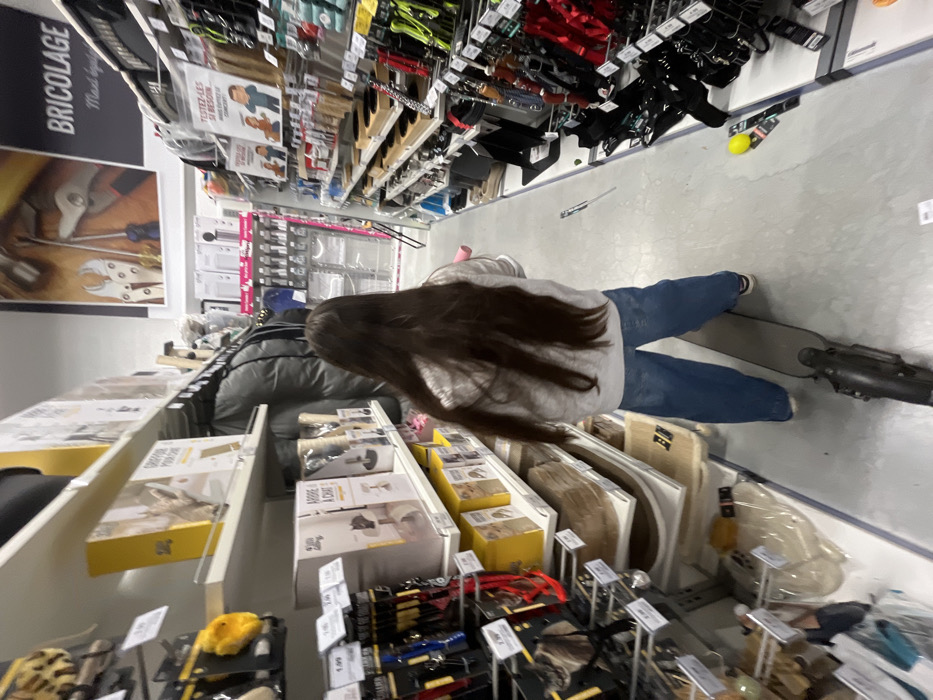 The image depicts an indoor retail store aisle in Reichstett, France. The environment is illuminated by overhead artificial lighting, casting an even light across the scene. The floor is a light grey, possibly concrete or polished, and appears generally clean, though a yellow ball and some small scattered debris are visible near the right-side shelving. The primary subject is a single individual, seen from behind, positioned centrally within the aisle and facing away from the camera. This person has long, straight dark brown hair extending down their back. They are wearing a light grey hooded sweatshirt and blue denim jeans. The individual is standing on a dark-colored electric scooter, suggesting they are either riding or pausing while on it. To the left, a multi-tiered shelving unit is stocked with various products. The upper shelves feature black containers and yellow-boxed items, some explicitly labeled "ARBRE À CHAT" (cat tree) and displaying images of cats. Below these, further shelves hold an assortment of packaged pet accessories, including leashes, collars, and harnesses, displayed on hooks, with visible price tags such as "1.99." The lower shelves exhibit rolled or folded items, possibly pet mats or beds, enclosed in clear plastic packaging. To the right, another multi-tiered shelving unit lines the aisle, displaying numerous products, many in plastic packaging. A large sign on the wall above these shelves prominently features the word "BRICOLAGE" (DIY/Hardware) and illustrates various tools, including pliers and a screwdriver. Further down the aisle, another sign is visible, stating "TESTEZ-LES SI BESOIN..." (Test them if needed...). No other individuals are present in the immediate vicinity, and no direct interactions are occurring.