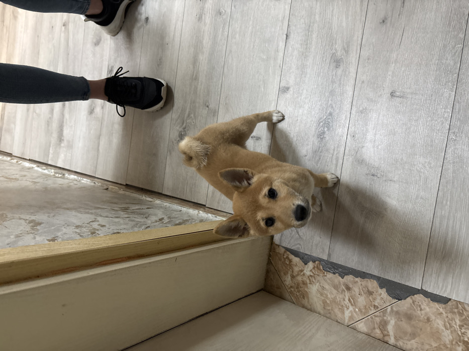 The scene depicts an indoor environment in Pernik, Bulgaria. A light brown Shiba Inu puppy with white paws and a curled tail stands on a light grey, wood-look laminate floor, looking upwards towards the camera. To the upper right, the lower legs and feet of a person are visible, wearing light blue jeans and black sneakers with thick white soles. The person is standing on the same laminate flooring. To the left, a light-colored doorframe with a narrow wooden trim is present. Adjacent to the doorframe and behind the puppy, a wall displays an irregular texture with patches of light grey and exposed underlying material, suggesting unfinished or damaged plaster. At the bottom left, a section of brown and beige marble-patterned tile flooring is visible, meeting the laminate floor with an uneven, broken edge.