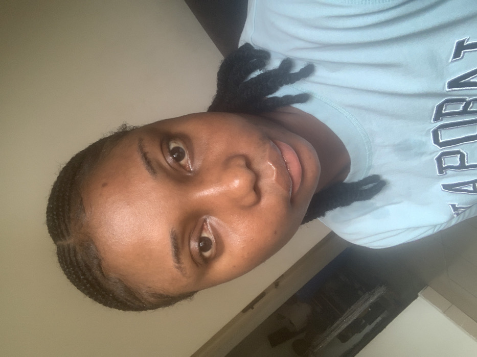 A medium close-up portrait features a young adult female with dark skin, directly facing the camera with a neutral expression