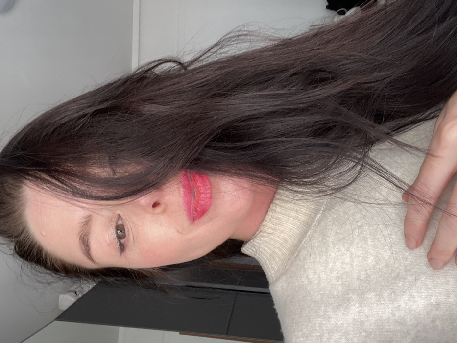 A close-up portrait shot features an adult female subject. Her dark brown hair, parted on the left, cascades over the right side of her face, partially obscuring her nose and mouth, and completely covering her right eye and cheek. The visible portion of her face on the left displays light skin, a brown eye with dark eyeliner, and a defined eyebrow. Her lips are parted in a slight smile, accentuated by vibrant pink lipstick. She wears a light beige or off-white turtleneck sweater, and her left hand rests flat against her chest over the fabric. The background is out of focus, revealing a dark vertical structure on the far left and a plain white surface on the upper right, indicative of an indoor setting. There are no discernible landmarks or contextual clues to determine a specific location within the city of Rome, Italy; the environment appears to be a generic interior space.