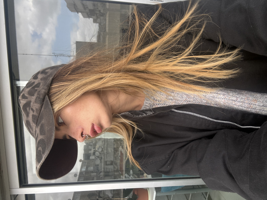 A female subject is captured from the upper torso, oriented slightly right of center, looking towards the left. She wears a dark grey, leopard-print baseball cap, a light grey textured sweater, and a black zip-up jacket. Her long, blonde hair is visible around her face and shoulders. A silver-colored, decorative septum piercing is present. The background shows an urban landscape viewed through a glass barrier, indicative of a high-rise balcony or window. Multiple multi-story residential or commercial buildings with flat roofs are visible under a partly cloudy sky. Architectural styles and density are consistent with an urban area in Tel-Aviv, Israel. Reflections of the sky and distant structures are visible on the glass. A blurred potted plant on a white shelf is partially visible on the far left.