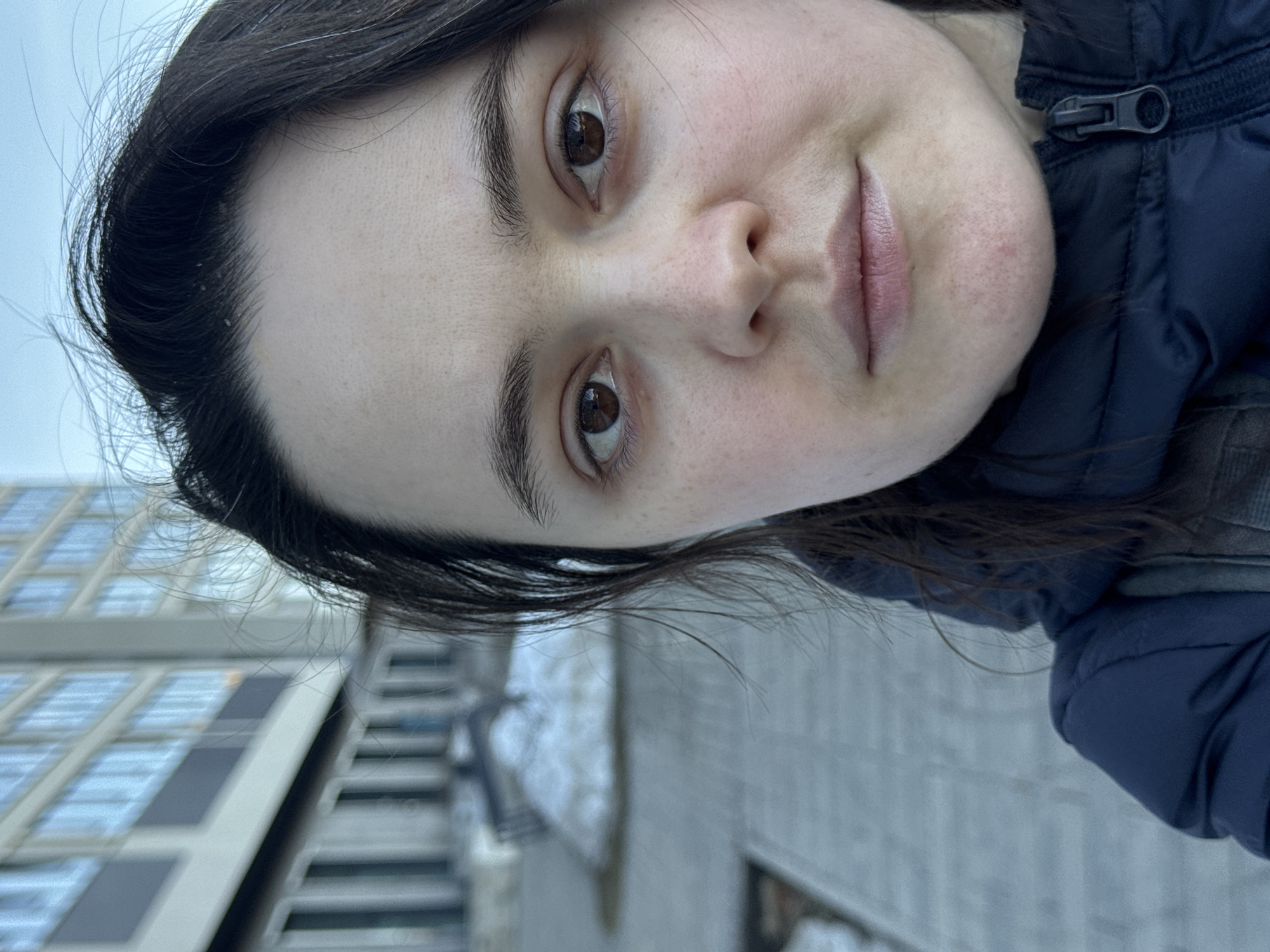 A selfie of a woman with dark hair and brown eyes. She is wearing a dark blue winter jacket. Snowflakes are visible in her hair. In the background, an apartment building is visible. Although the location is said to be Izhevsk, Russia, there is no information in the photo that can confirm this.